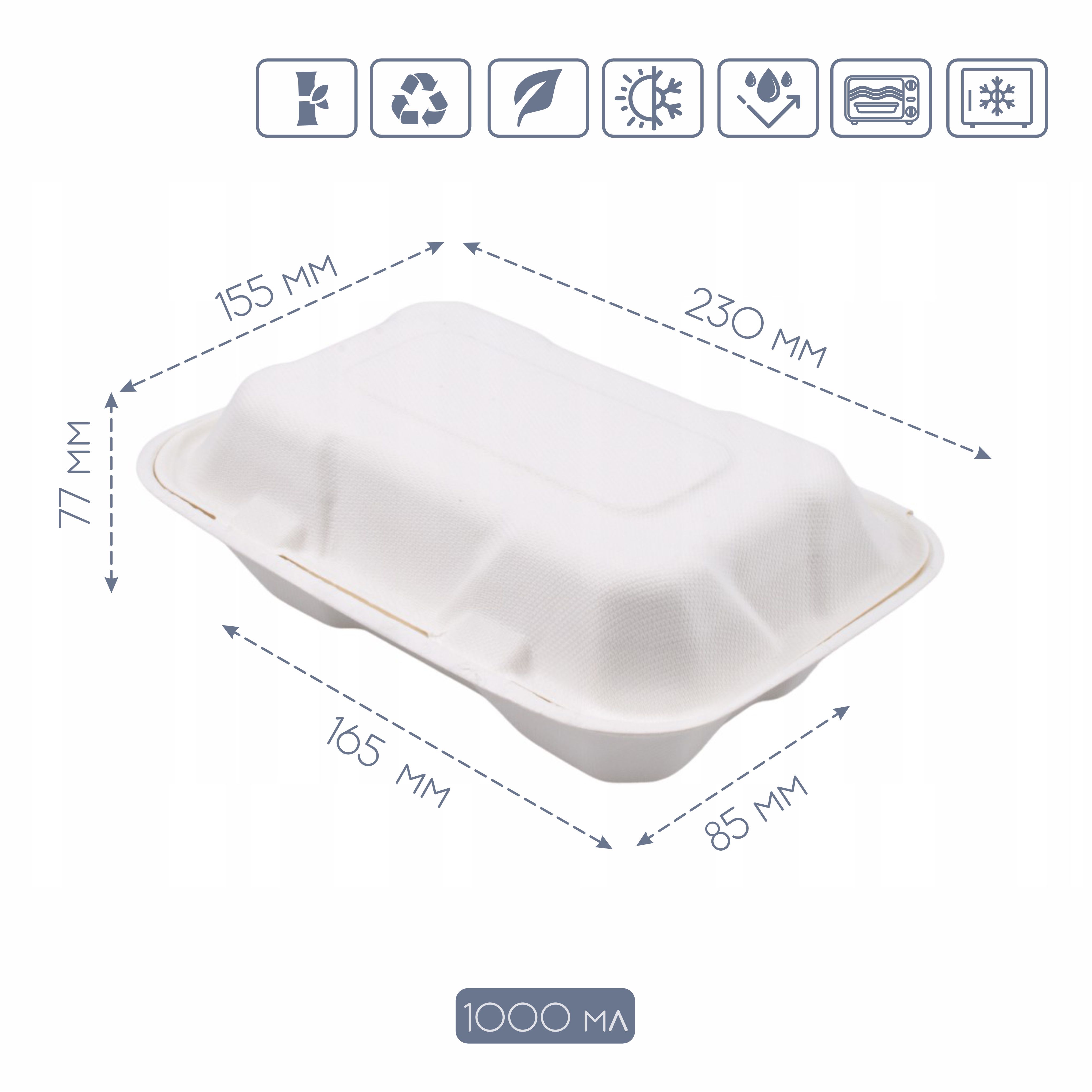 Розмір: Зручний розмір 230х155х77 мм робить його універсальним для пакування різноманітних продуктів — від готових страв і снеків до кондитерських виробів та товарів ручної роботи.
