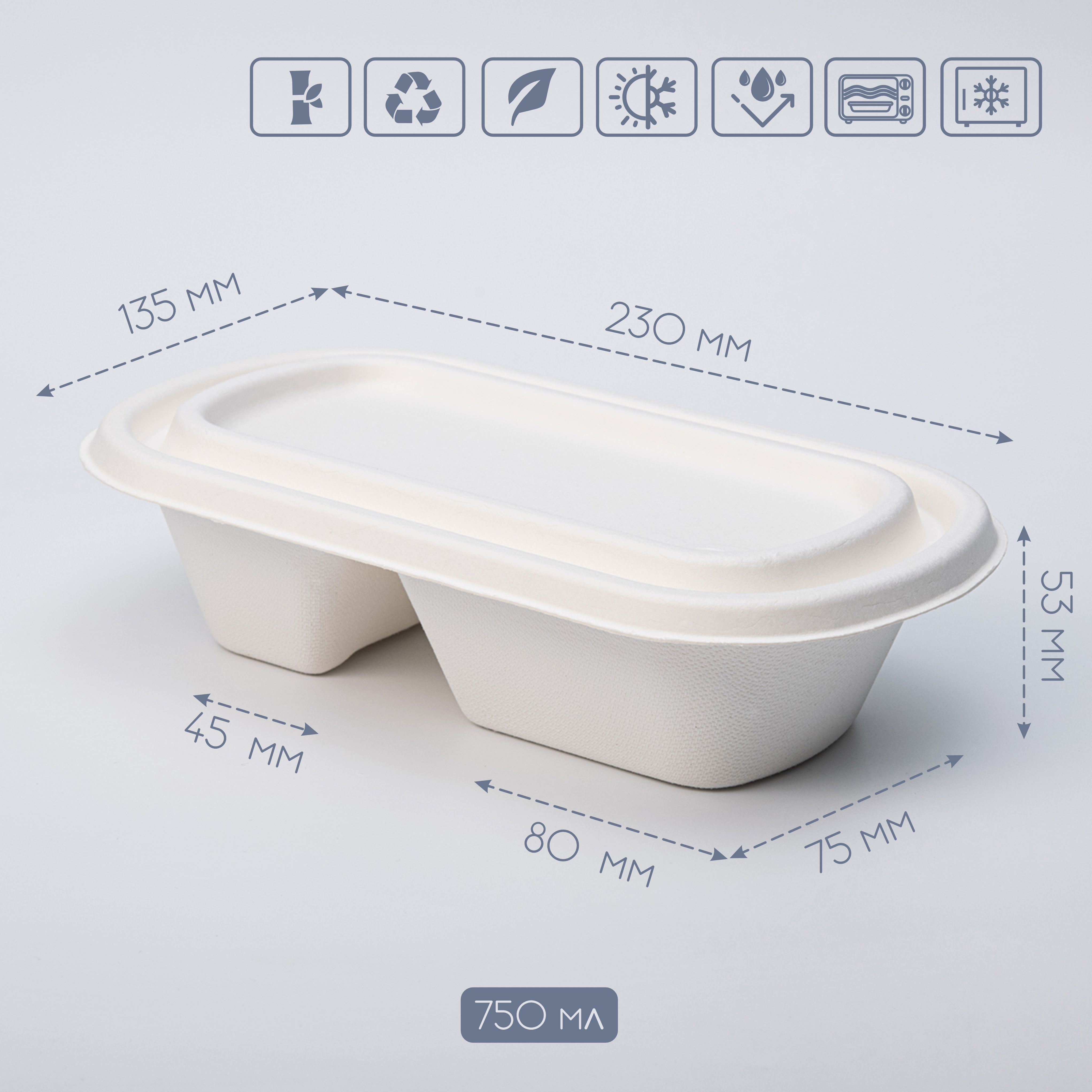 Бокс із тростини на 2 поділи 750 мл 230х135х53 мм (500 шт/ящ): Зручність та екологічність