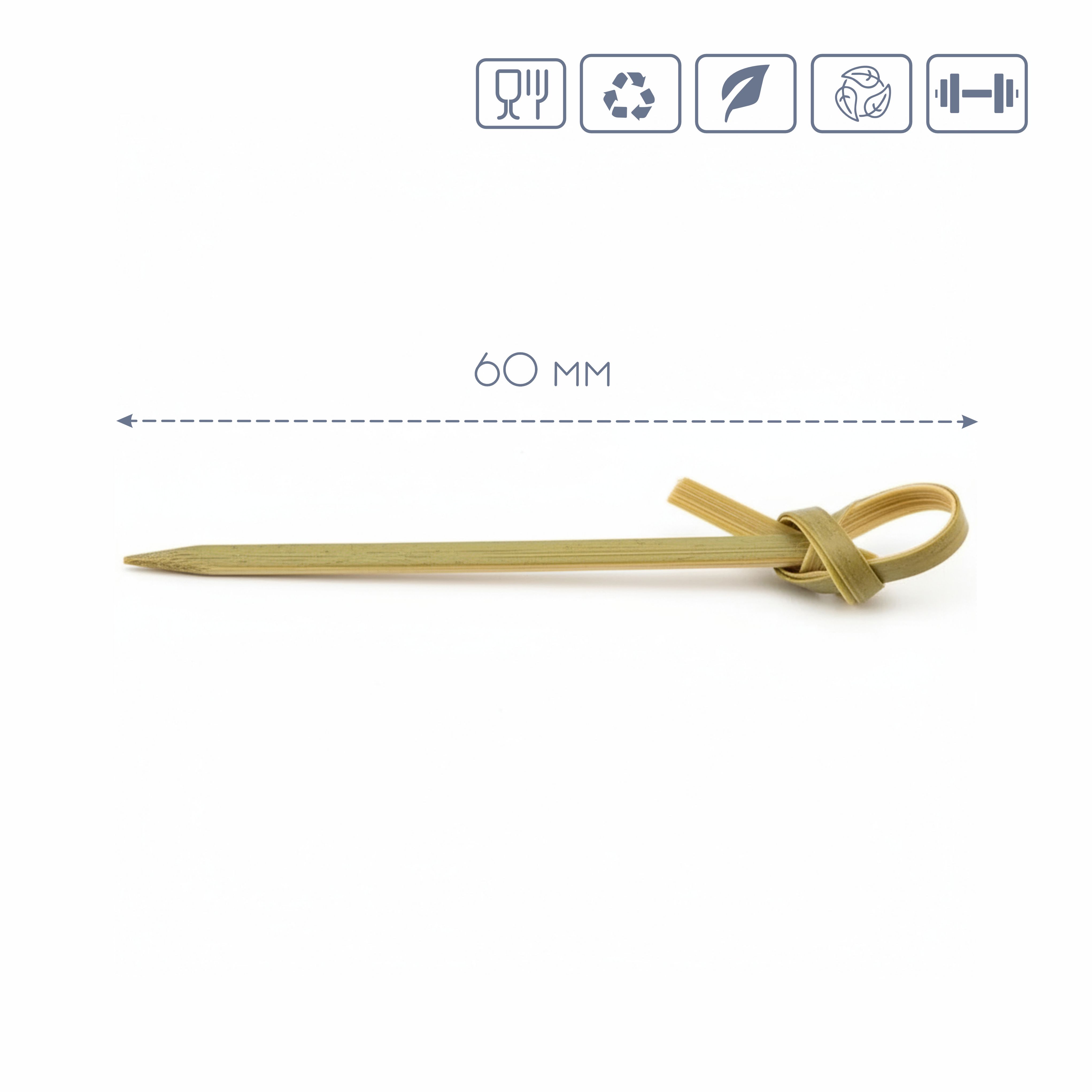 Виготовлена з натурального бамбука, шпажка є екологічною, безпечною для контакту з їжею та не впливає на смак продуктів. Коротка довжина 6 см ідеально підходить для невеликих канапе, оливок, сирних кубиків, фруктів та дегустаційних сетів.