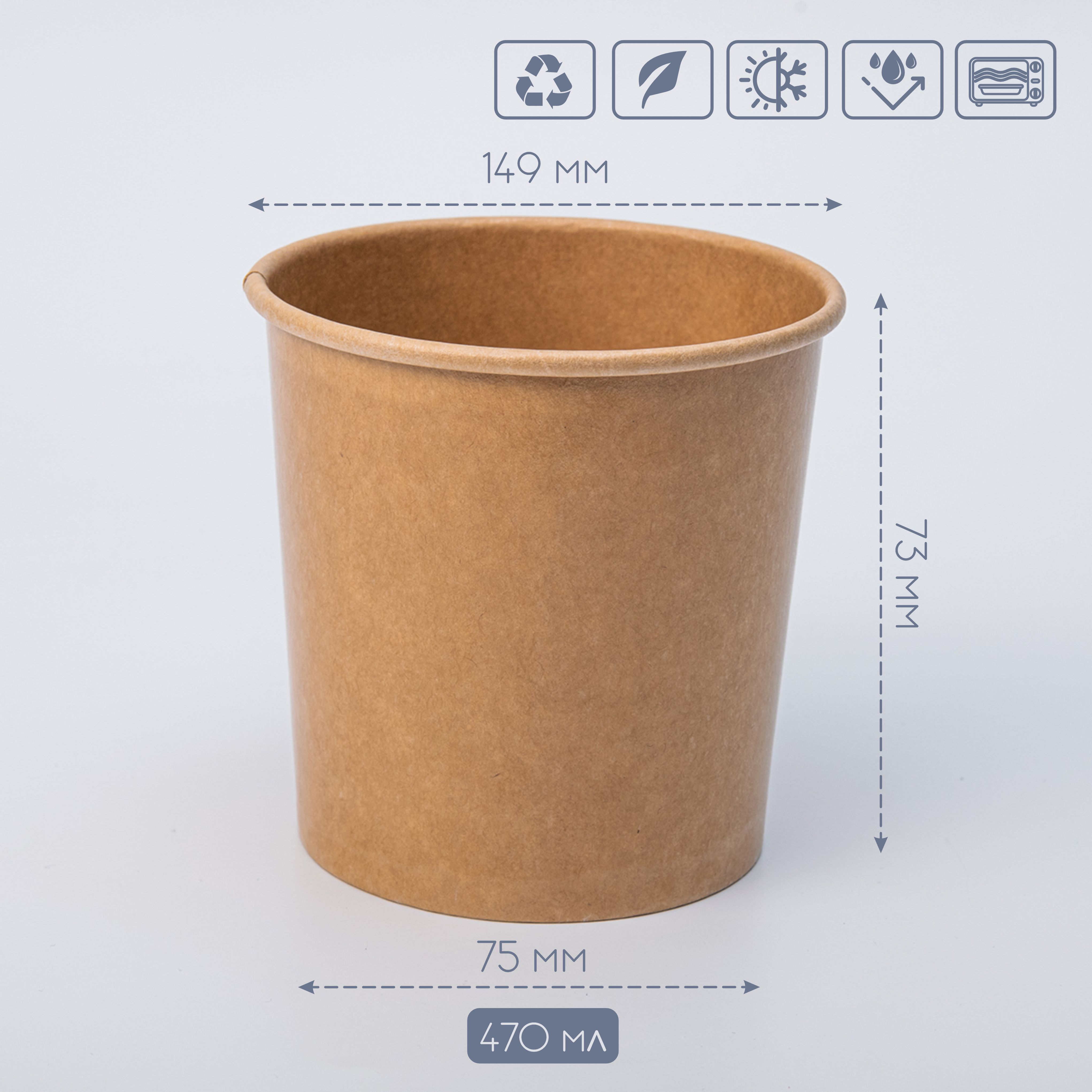 Крафтова супниця, на 100% складається з якісного целюлозного картону. Має матову поверхню і приємна на дотик. Усередині нанесена ламінація. Жиро і вологостійка. Виготовлена без клею, не має сторонніх запахів. Може бути використана в мікрохвильовій печі. Відмінно підійде для доставки невеликої порції супу, гарячої страви або упаковки десерту - морозива або мусу. Обєм- 470 мл. Розміри 96*76*95мм Розміри Коробки 35*48.5*40см Вага Коробки 6.75кг Мінімальне замовлення - 1уп. В упаковці 50шт, в ящику 500шт///////