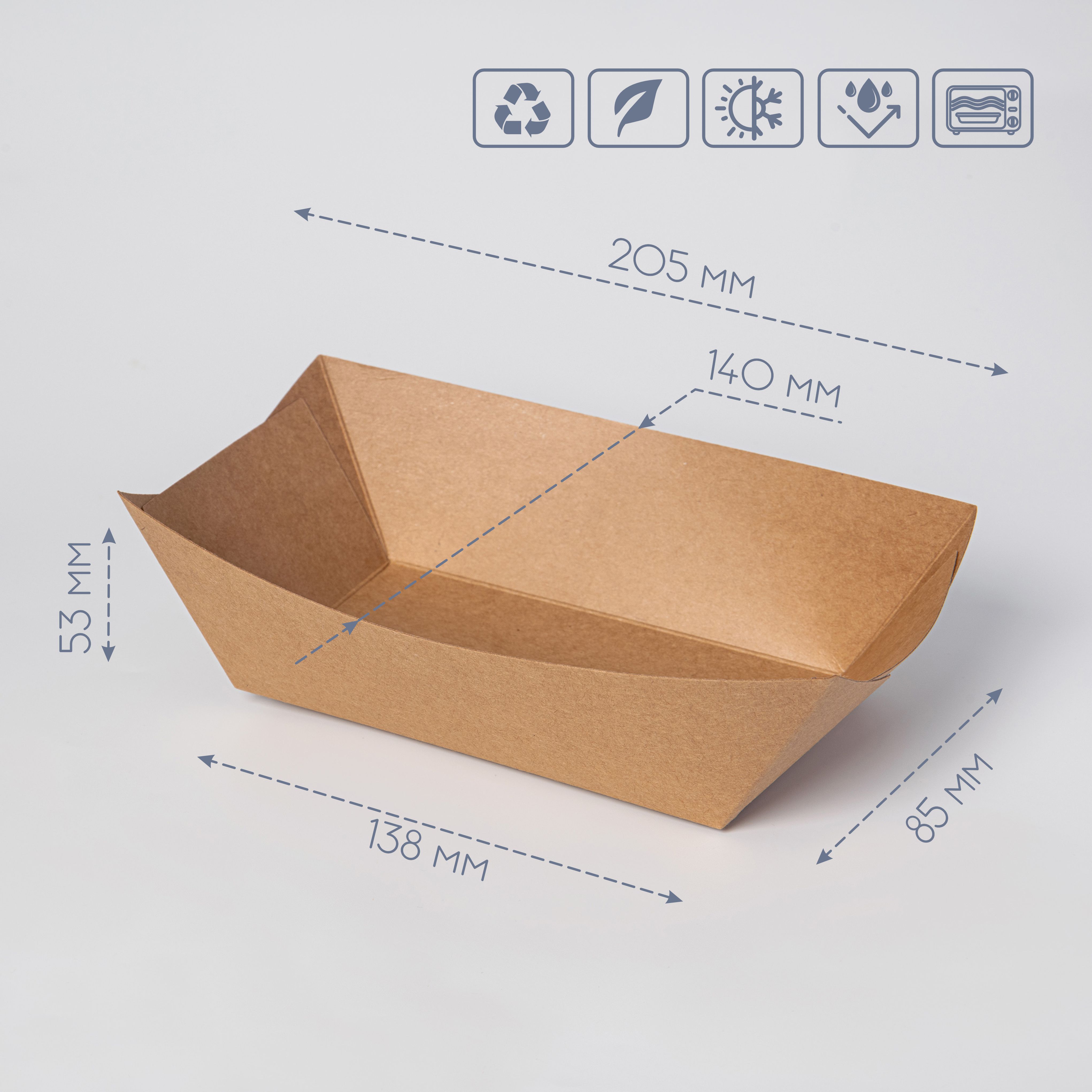 Розмір (ДxШxВ): 138х85х53 мм. Це ідеальний розмір для стандартної порції картоплі фрі, невеликої порції нагетсів, рибних паличок або хот-дога.