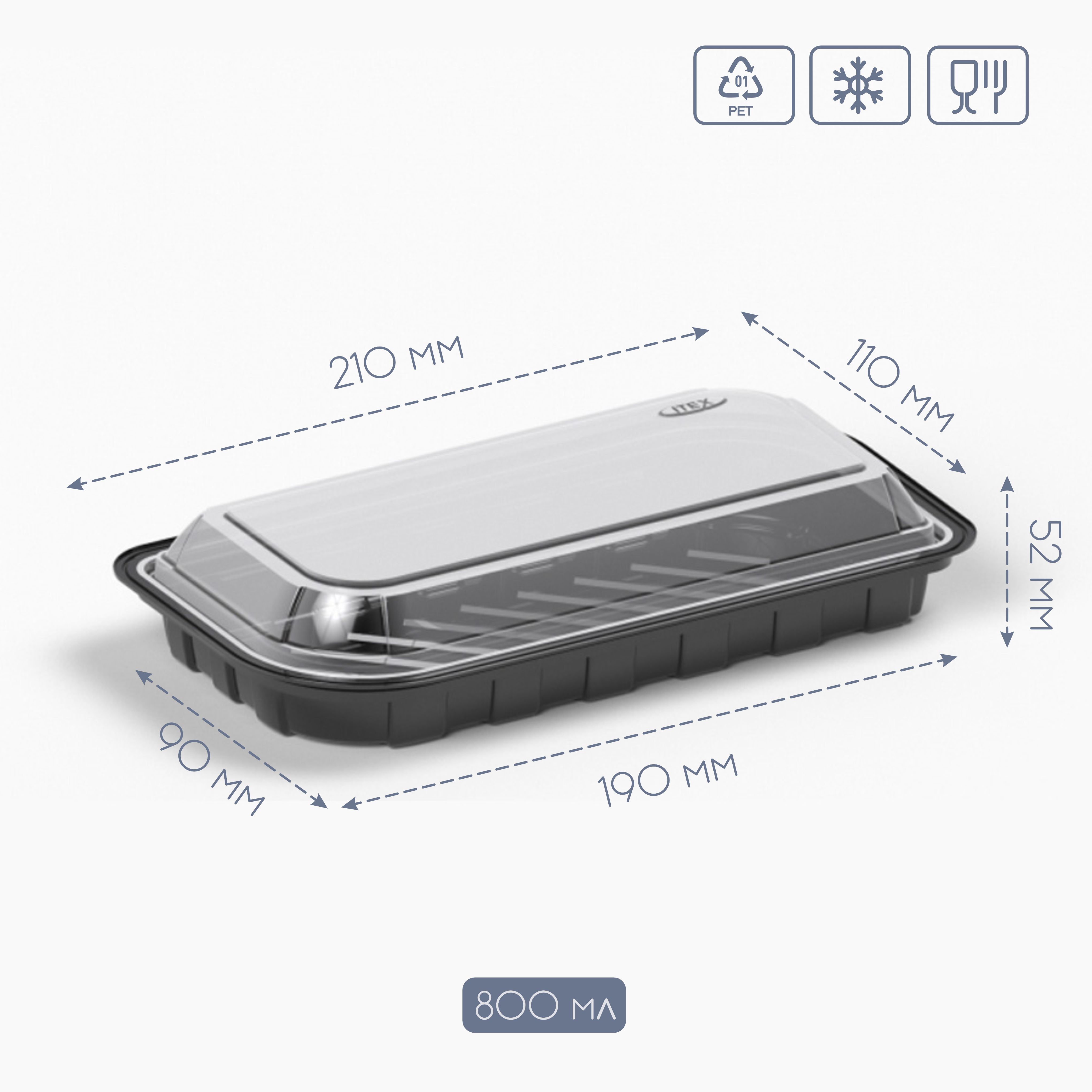 Ідеальний розмір для сетів: Розмір контейнера (210х110х52 мм) ідеально підходить для пакування стандартних порцій суші, сашимі, нігірі або невеликих сетів. Це дозволяє ефективно використовувати простір та презентувати страву в максимально вигідному світлі.