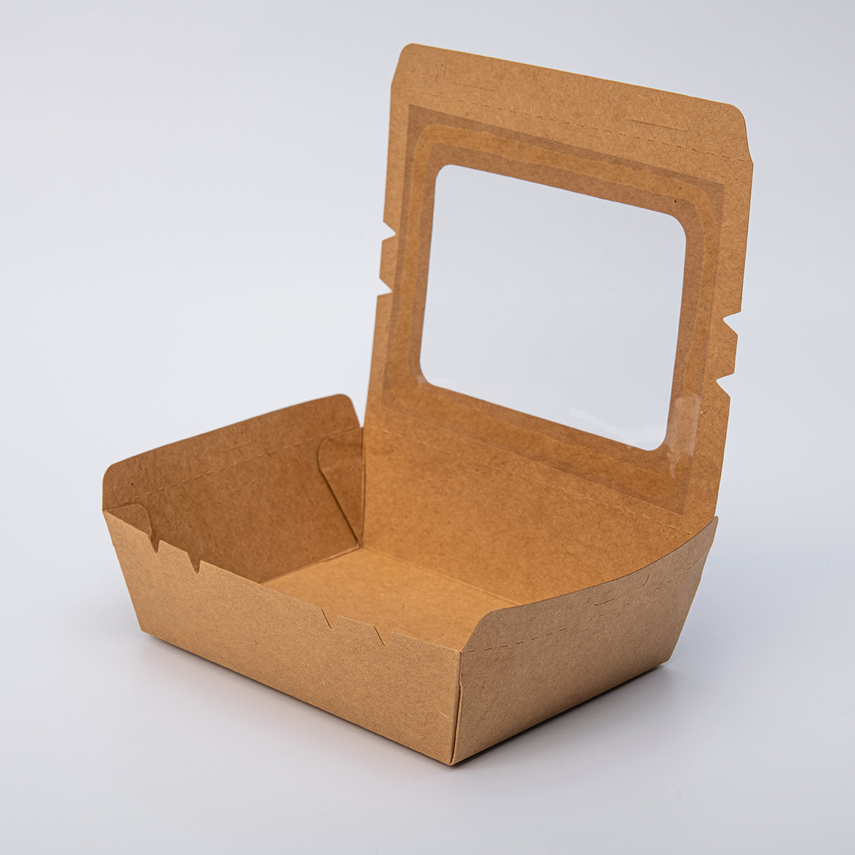 Виготовлений із натурального крафт-картону, цей контейнер забезпечує надійність і безпечність під час контакту з харчовими продуктами. Завдяки прозорому вікну страви всередині виглядають ще апетитніше, що підвищує привабливість для клієнтів.