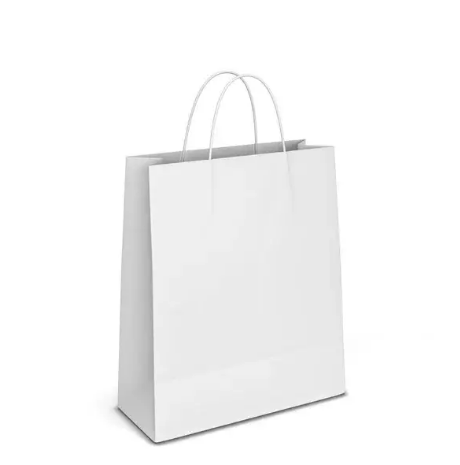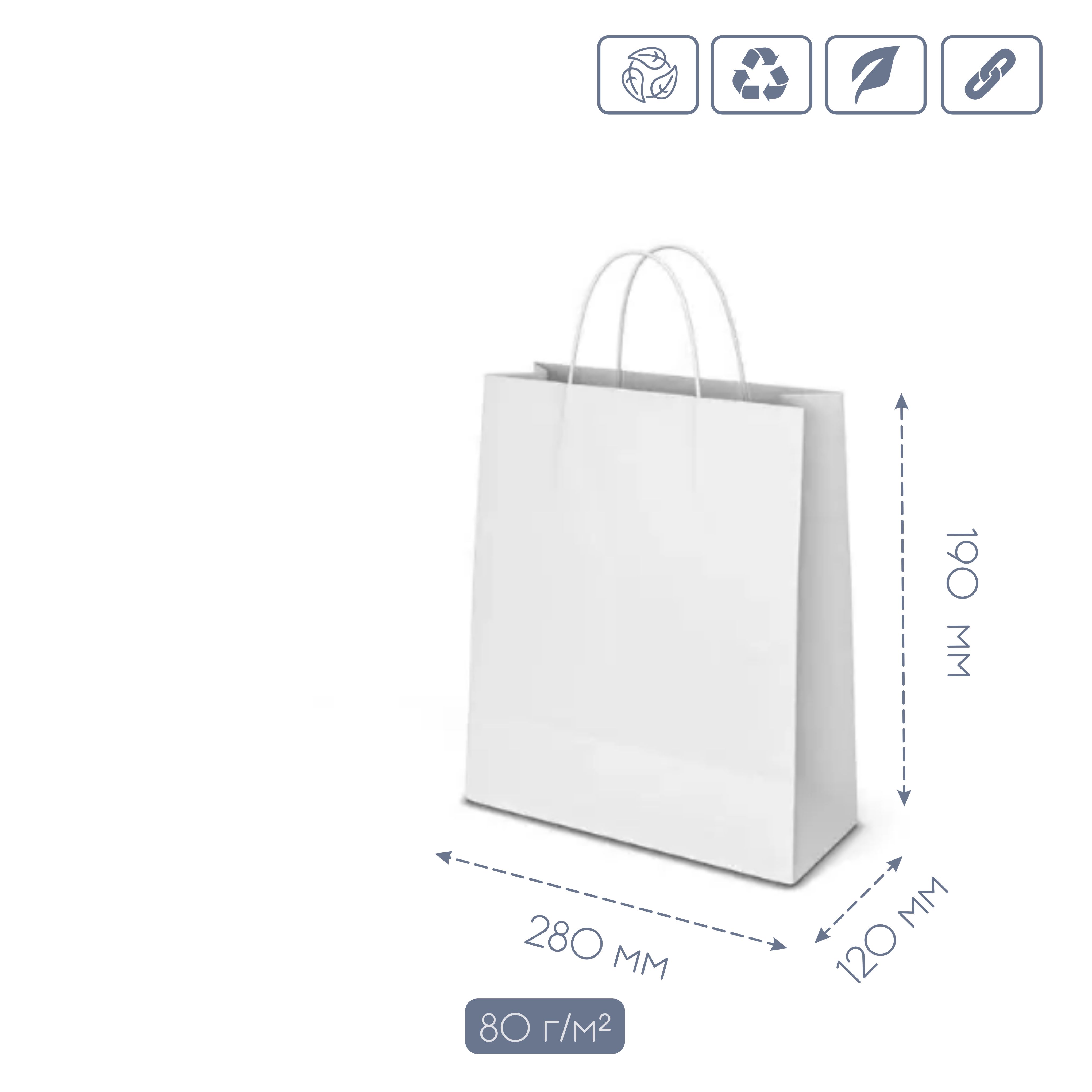 Білий міцний паперовий пакет з ручками з прямокутним дном, виготовлений з крафтового паперу.Висота - 280 мм. Ширина - 190 мм. Дно - 120 мм.Витримує вагу до 3 кг. Має матову поверхню і рівні обрізні краю. Без ламінації.Відмінно підійде для доставки і зберігання страв і будь-яких продуктів.
