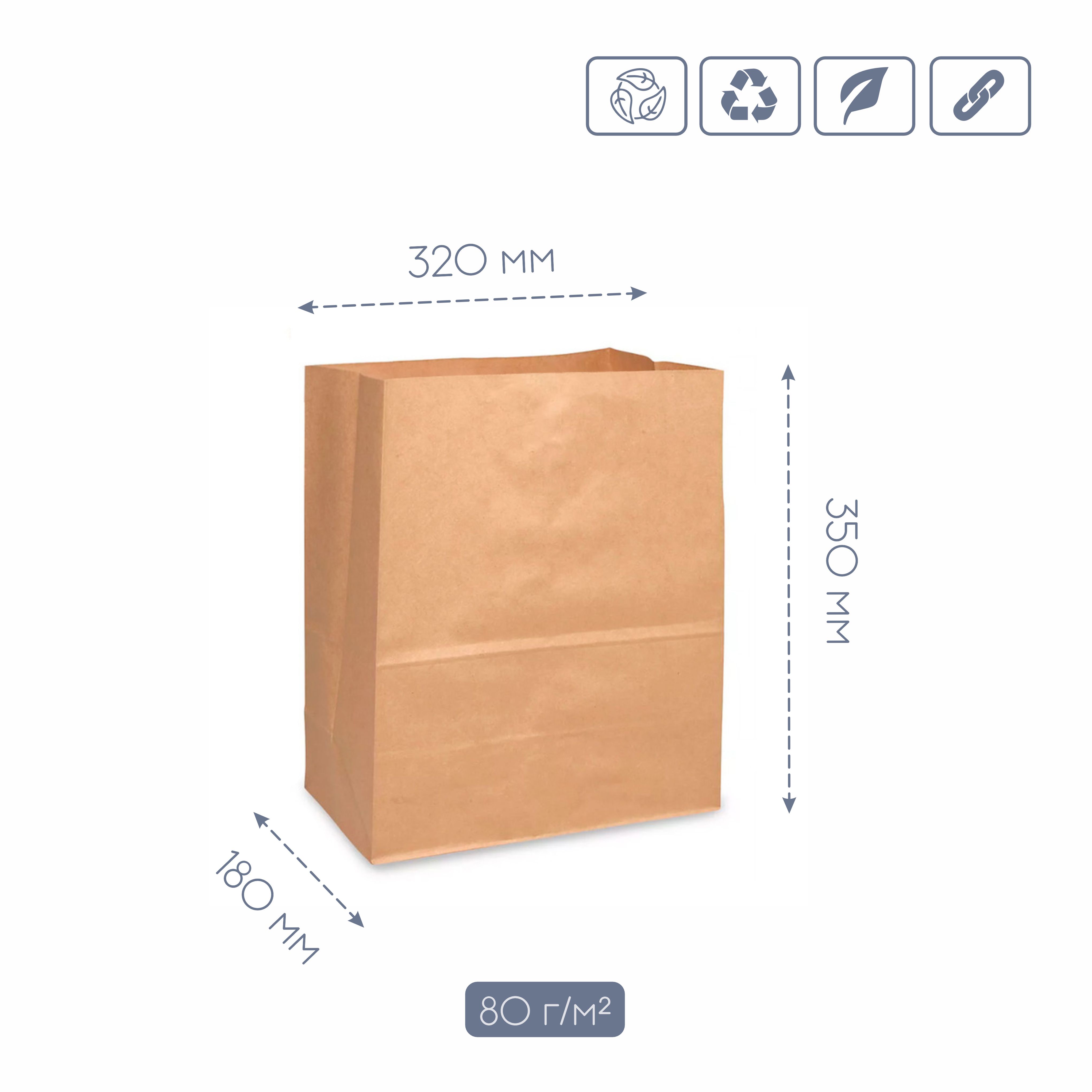 Універсальність та місткість: Завдяки оптимальним розмірам 320х180х350 мм, цей пакет ідеально підходить для пакування різноманітних товарів. Він достатньо місткий, щоб вмістити кілька коробок з їжею на винос, одяг, книги, сувеніри чи продукти. Відсутність ручок робить його ідеальним для тих випадків, коли товар пакується в додатковий пакет або сумку, або якщо ви використовуєте окремі ручки чи скотч для зручності транспортування.