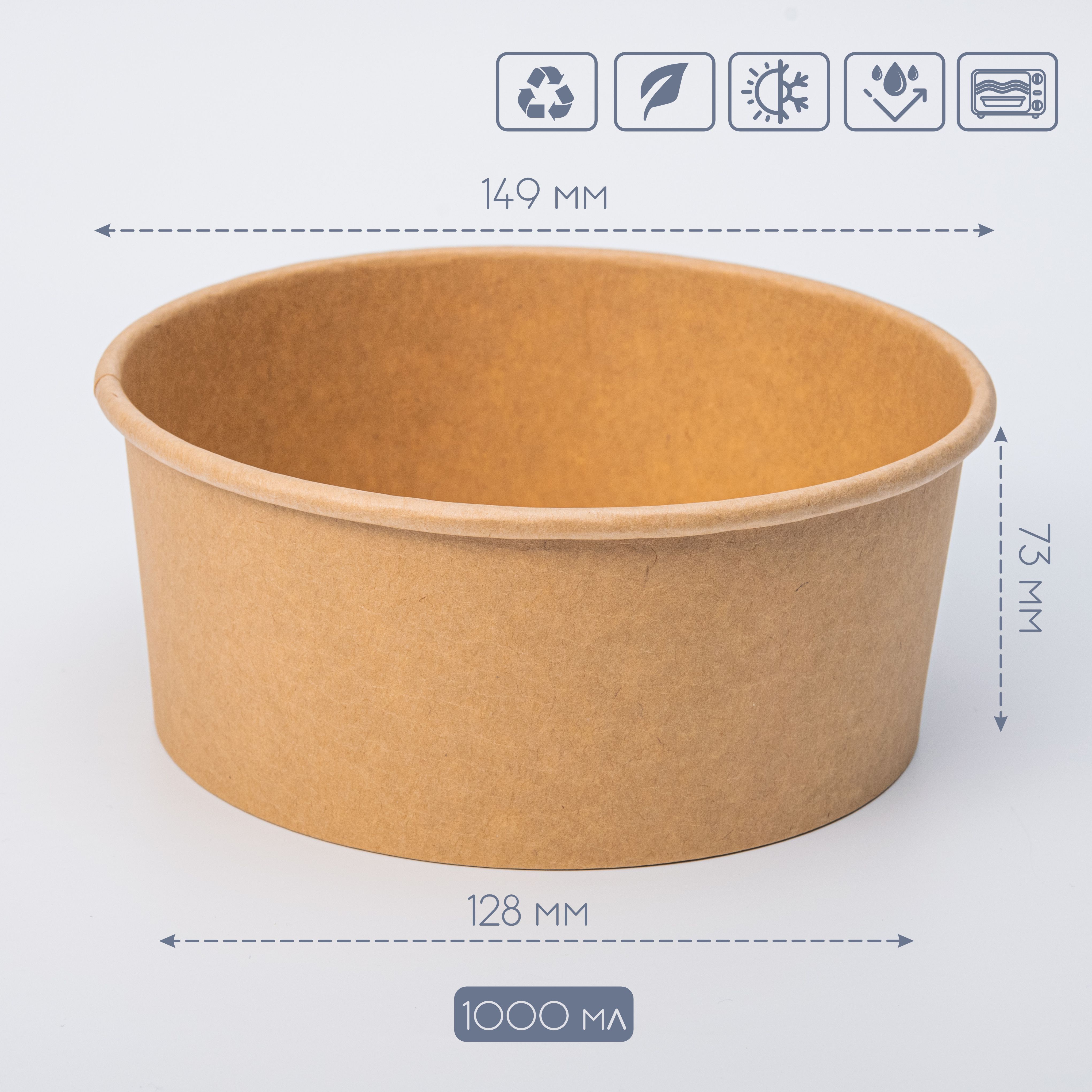Крафтовий круглий контейнер, на 100% складається з якісного целюлозного картону. Має гладку поверхню та приємний на дотик. Всередині нанесена ламінація. Жиро-і вологостійкий. Виготовлений без використання клею, не має сторонніх запахів. Може використовуватися як з гарячими продуктами, так і для розігріву в мікрохвильовій печі. Відмінно підійде для упаковки і доставки більшої порції салату, супу, гарячого та фастфуду. Комплектом до товару Ви можете придбати кришку для контейнера, яку знайдете у відповідному розділі сайту. Максимальний об`єм - 1000 мл. Розміри 149*130*70мм Розміри Коробки 53*46*32см Вага Коробки 5,99кг Мінімальне замовлення - 1уп. В упаковці 50шт, в коробці 300шт.