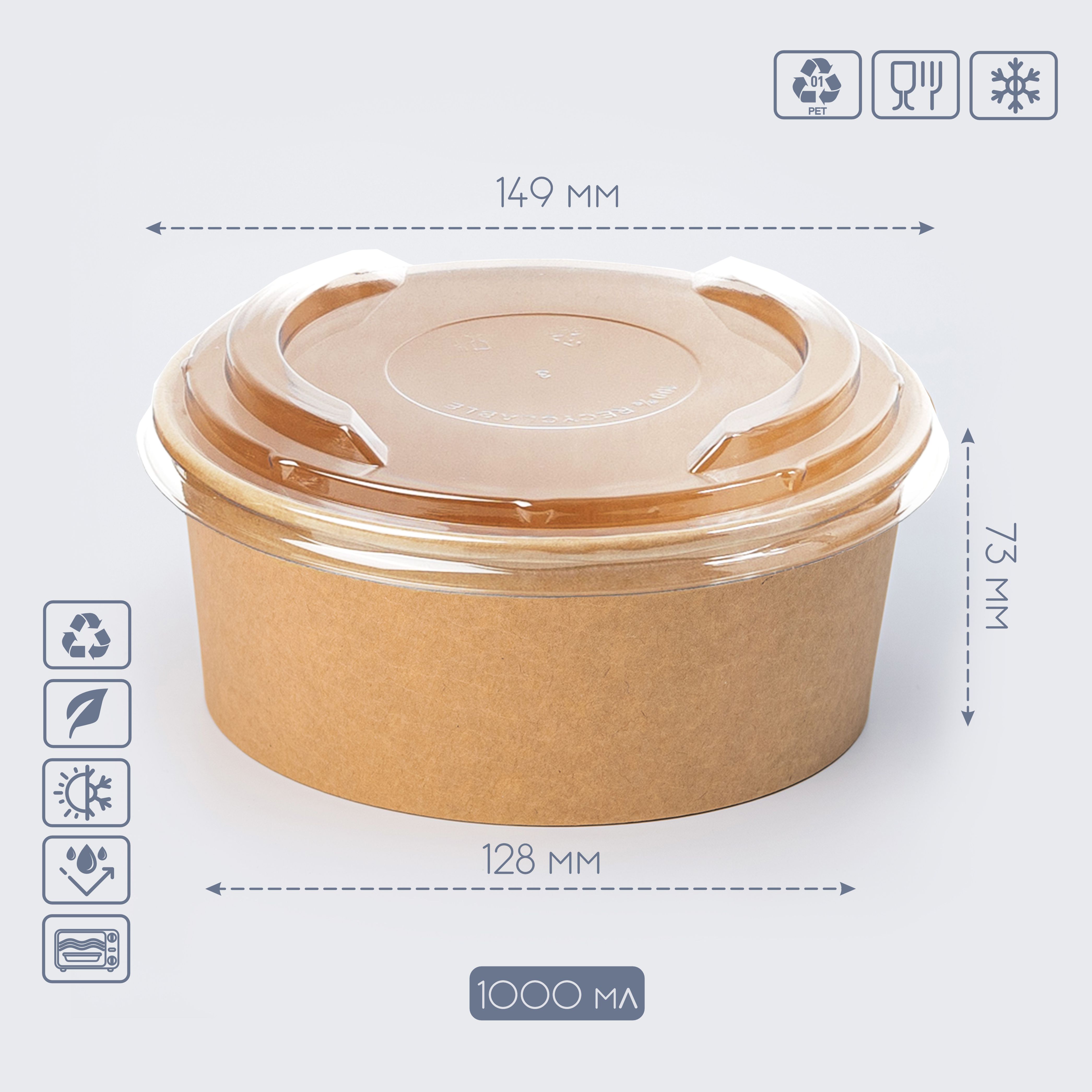 Крафтовий круглий контейнер, на 100% складається з якісного целюлозного картону. Має гладку поверхню та приємний на дотик. Всередині нанесена ламінація. Жиро-і вологостійкий. Виготовлений без використання клею, не має сторонніх запахів. Може використовуватися як з гарячими продуктами, так і для розігріву в мікрохвильовій печі. Відмінно підійде для упаковки і доставки більшої порції салату, супу, гарячого та фастфуду. Комплектом до товару Ви можете придбати кришку для контейнера, яку знайдете у відповідному розділі сайту.