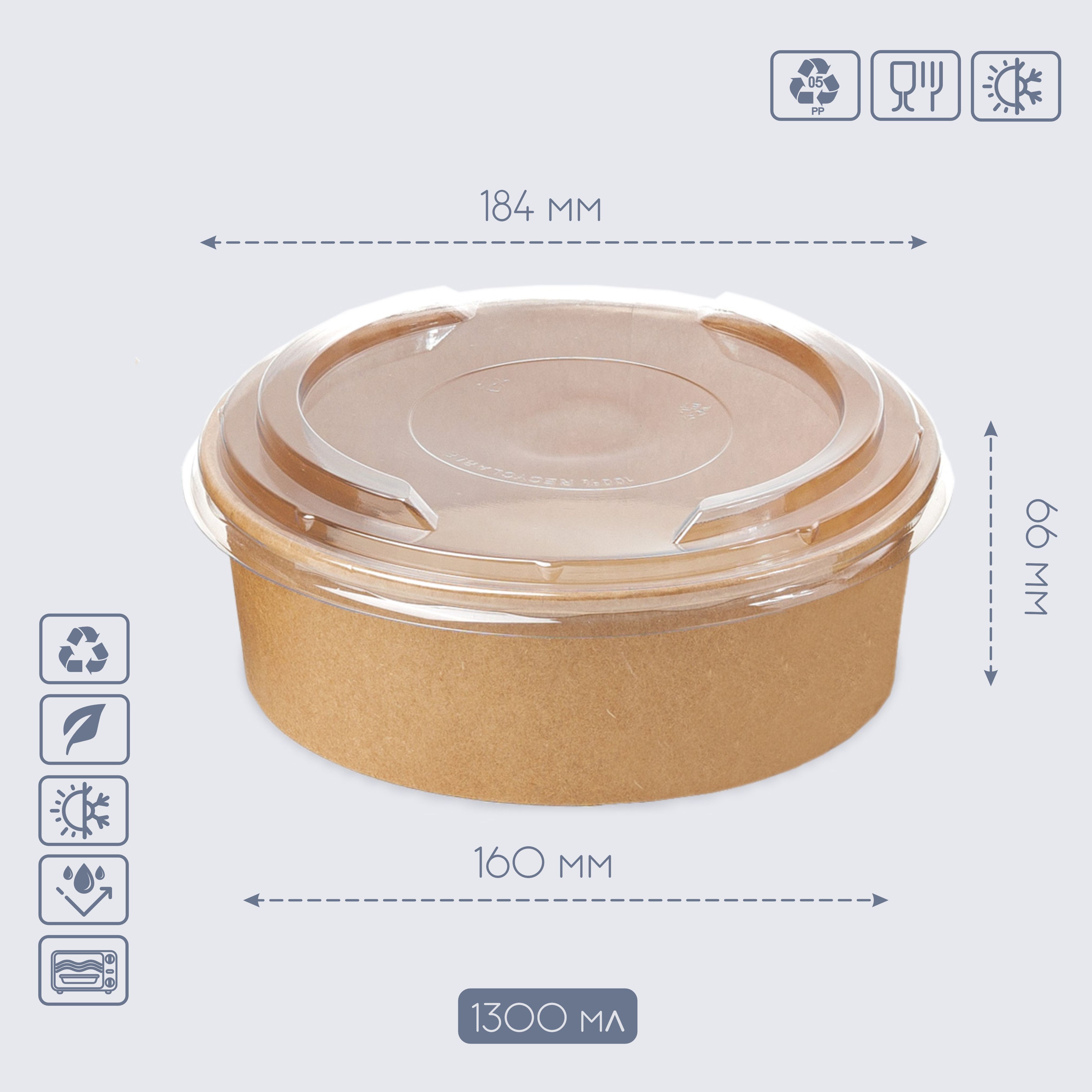 Крафтовий круглий контейнер, на 100% складається з якісного целюлозного картону. Має гладку поверхню та приємний на дотик. Всередині нанесена ламінація. Жиро-і вологостійкий. Виготовлений без використання клею, не має сторонніх запахів. Може використовуватися як з гарячими продуктами, так і для розігріву в мікрохвильовій печі. Відмінно підійде для упаковки і доставки більшої порції салату, супу, гарячого та фастфуду. Комплектом до товару Ви можете придбати кришку для контейнера, яку знайдете у відповідному розділі сайту.