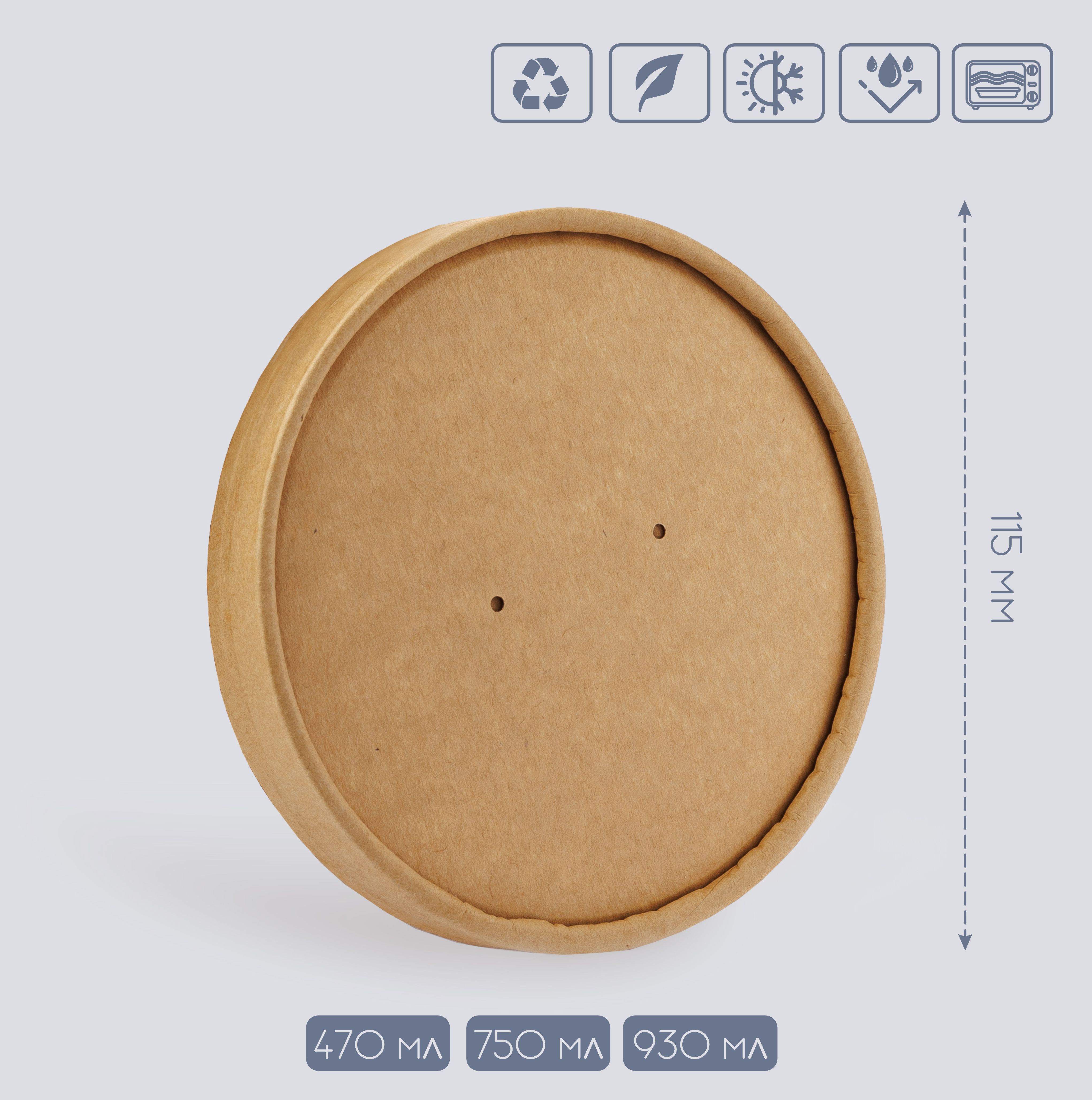 Пластикова прозора кришка для контейнера 750 і 930мл. Кришка щільно прилягає до контейнера, не даючи страві протекти. Підходить: для доставки перших страв, має отвір проти утворення конденсату. Кришка виготовлена з поліпропілену - це означає що кришка підходить для переробки. Її можна використовувати для розігрівання в мікрохвильовій печі. Розміри 115мм Розміри Коробки 31.5*60.5*26см Вага Коробки 3.55кг