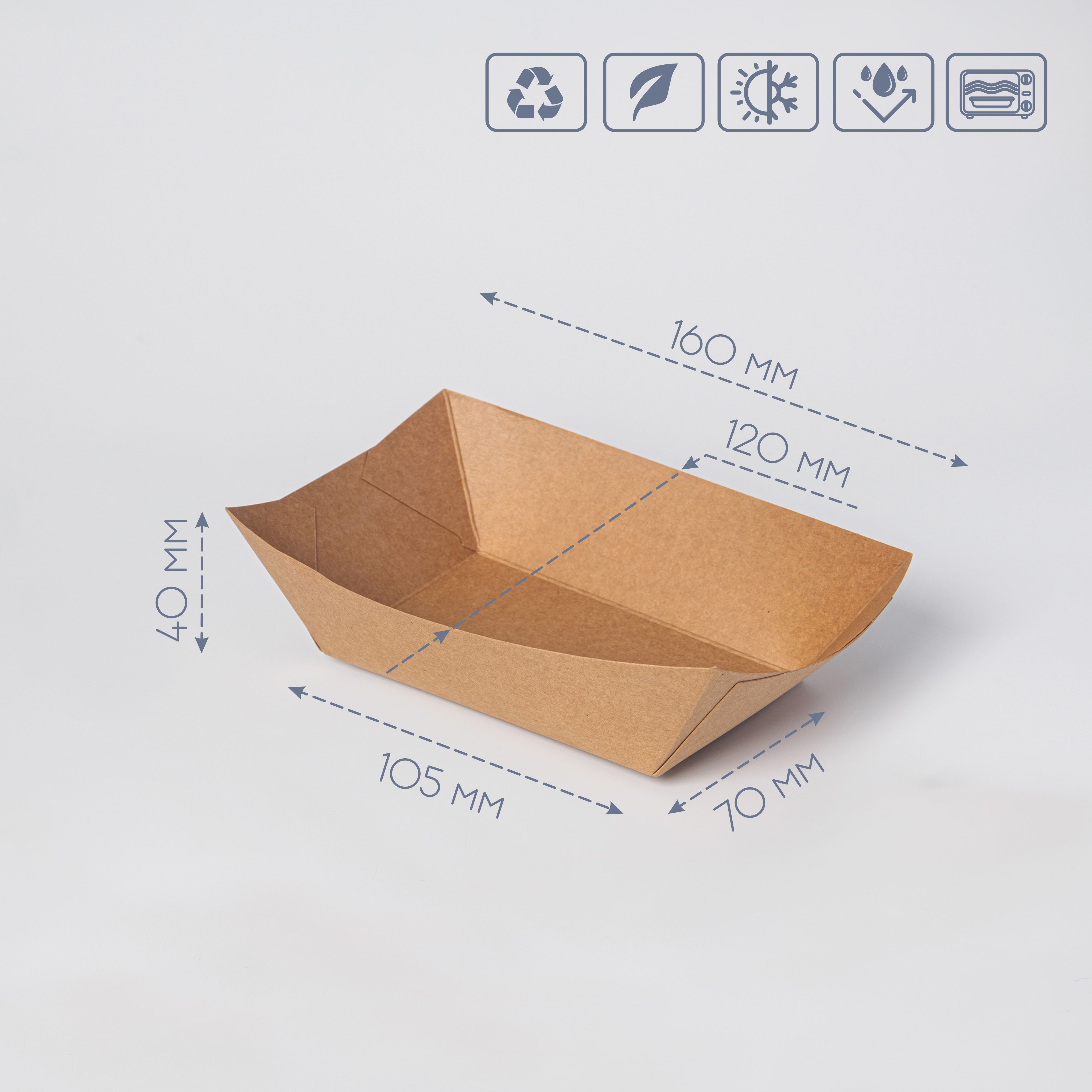 Тарілка човник крафт (1000 шт/ящ) — практичне, екологічне та зручне рішення для подачі їжі у кафе, фудтраках, на заходах або для закусок у форматі street-food. Ця паперова форма у вигляді човника зроблена із міцного крафт-картону, який витримує тепло, жир та вологу, не деформується та забезпечує зручність використання навіть для гарячих страв.