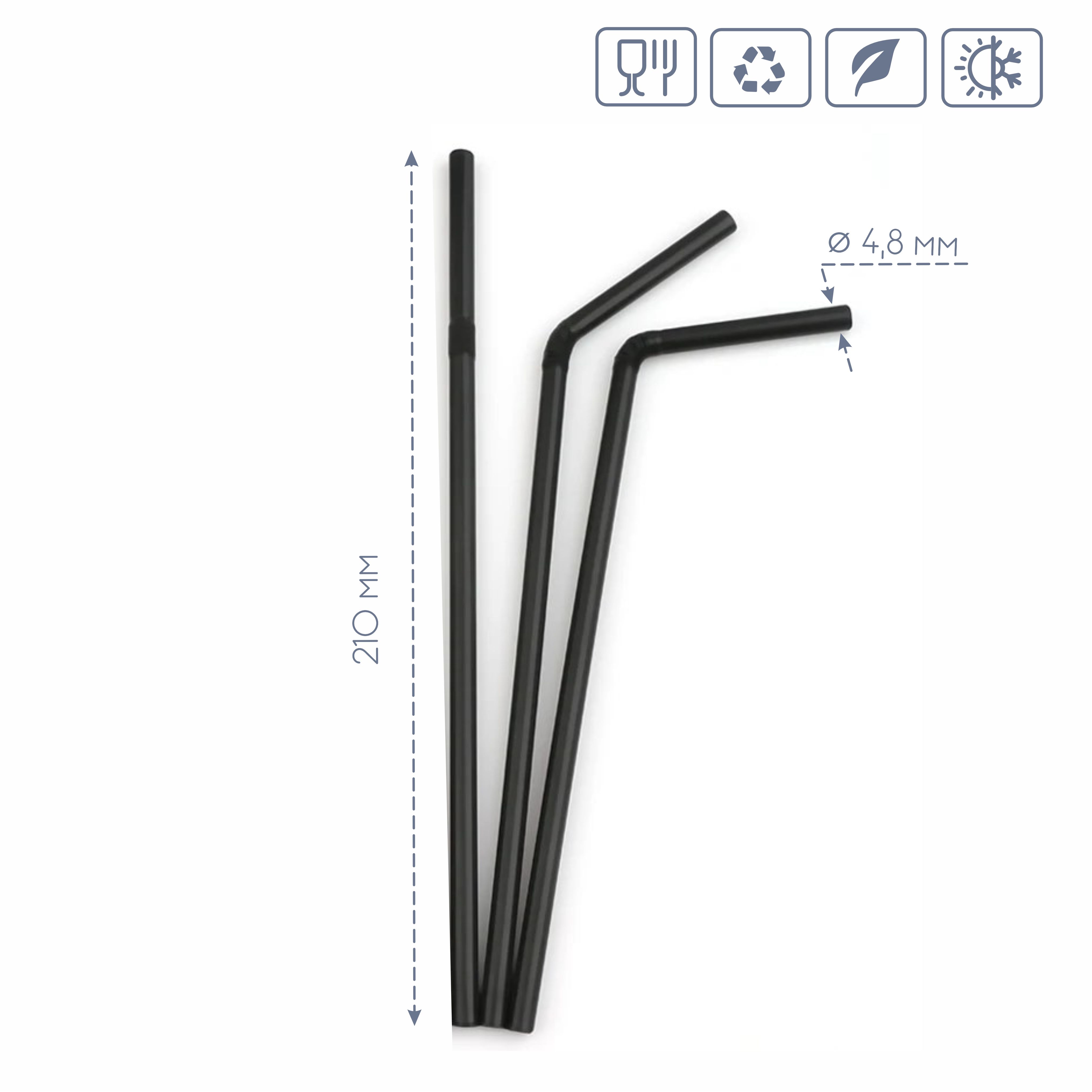 Універсальне застосування: Завдяки стандартному розміру (D4,8*210 мм), трубочка підходить для різноманітних холодних та гарячих напоїв: соків, лимонадів, коктейлів, кави, чаю та мілкшейків.
