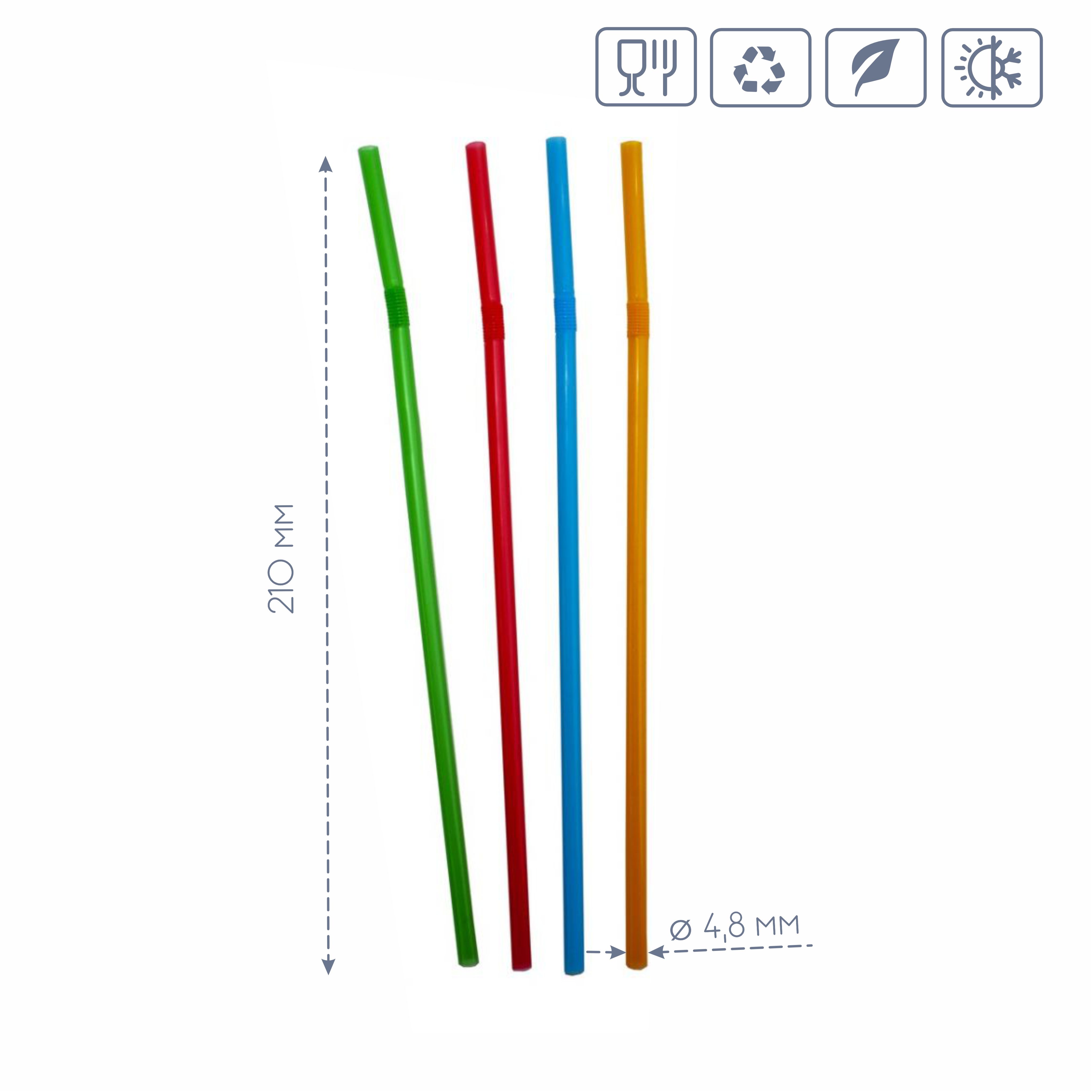 Універсальне застосування: Завдяки стандартному розміру (D4,8*210 мм) та гнучкому елементу, трубочки підходять для будь-яких холодних та помірно гарячих напоїв: коктейлів, лимонадів, соків, мілкшейків та смузі.
